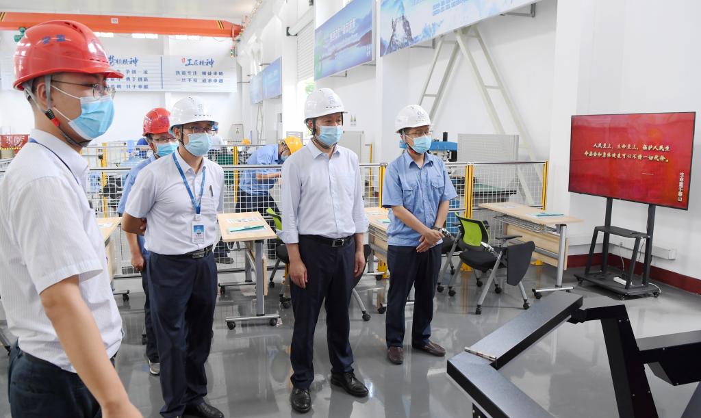 在建设中的东方汽轮机新型二氧化碳储能验证系统项目和叶片加工黑灯产线,东方锅炉氢产业科技示范园和化学链燃烧兆瓦级中试试验示范装置项目现场,俞培根强调要强化现场施工管理,在确保安全的前提下有序推进项目施工进度,坚决守住安全底线、筑牢安全防线,他还感谢相关技术人员、建设人员的辛勤付出,勉励他们勇于拼搏、争创一流,为集团公司“绿色智造”转型作出新的更大贡献。在东方电机安全体验基地,俞培根现场观看了体验式脚手架登高培训、VR模拟安全体验等演示,强调要常态化开展安全教育培训以及演练活动,进一步增强职工安全意识与安全技能。检查期间,俞培根还对各企业抓好疫情防控、防控质量风险等提出具体要求。