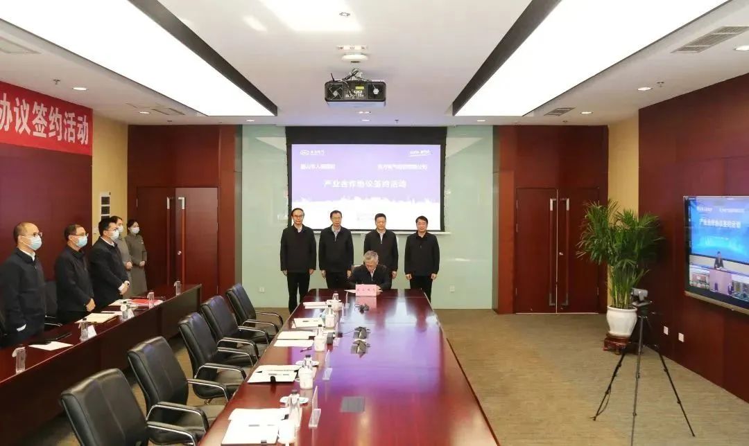 与唐山市人民政府通过云签约方式签署产业合作协议。张彦军、郝志军代表双方签字。