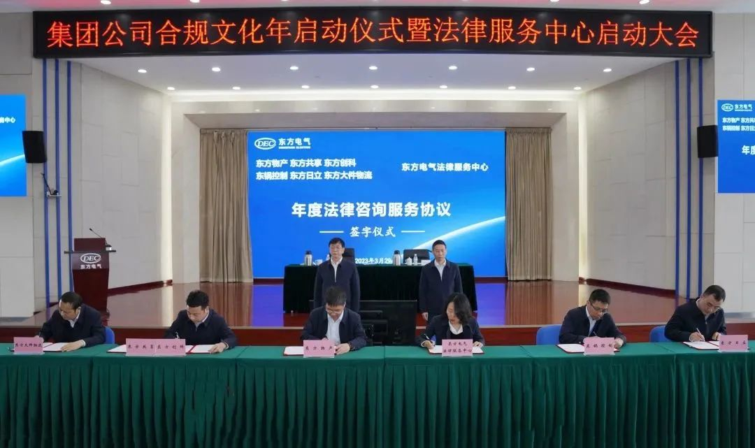 东方物产、东方共享、东方创科、东锅控制、东方日立、东方大件物流等六家企业与法律服务中心签订了首批《年度法律咨询服务协议》,标志着法律服务中心的专业法律服务正式启动。会上还首发了集团公司法务风控部联合法律服务中心创办的季刊《法智东方》。