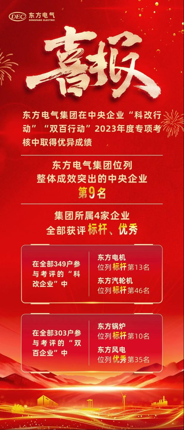集团所属4家企业均取得优异成绩,其中东方电机、东方汽轮机分别位列“科改行动”标杆企业第13名、标杆企业第46名,东方锅炉、东方风电分别位列“双百行动”标杆企业第10名、优秀企业第35名。