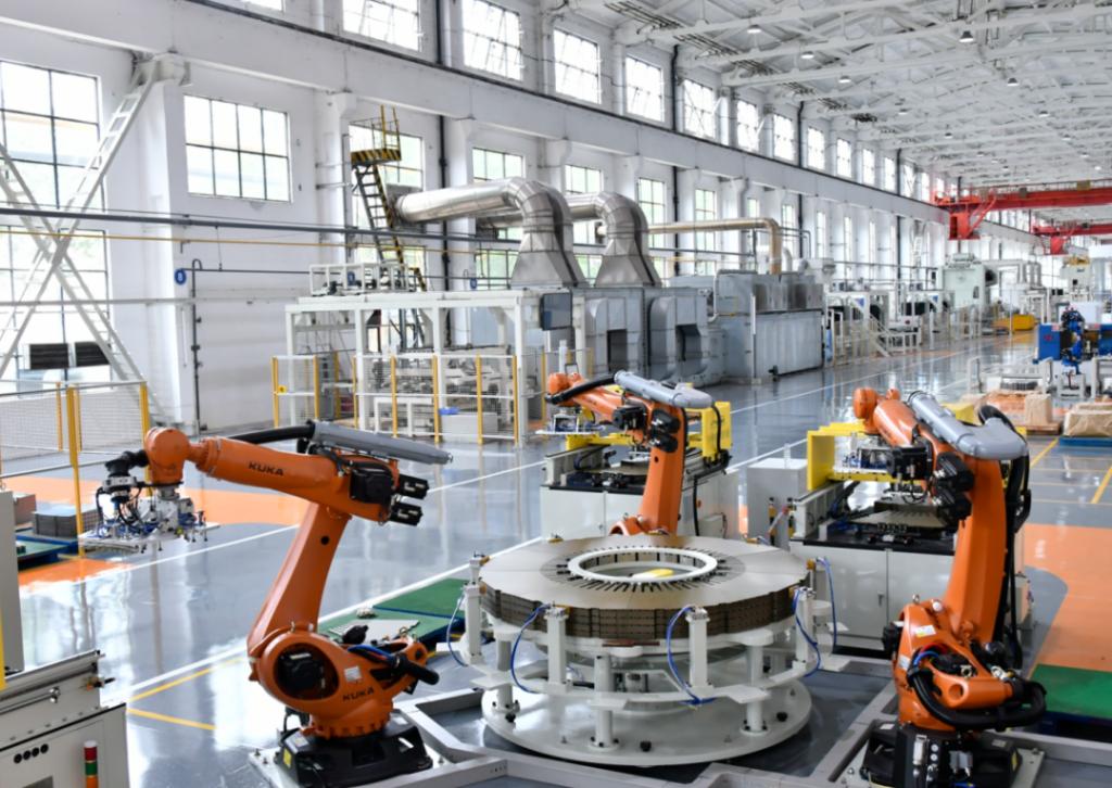 集团以数字化引领绿色发展,坚持“产品智能化和制造智能化”双轮驱动,加大工业机器人应用力度,大力推进绿色示范车间、绿色示范工厂创建,着力提高生产领域节能降碳水平。图为行业首个定子冲片绿色“无人车间”。做爱影片
